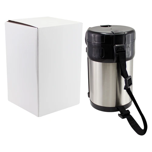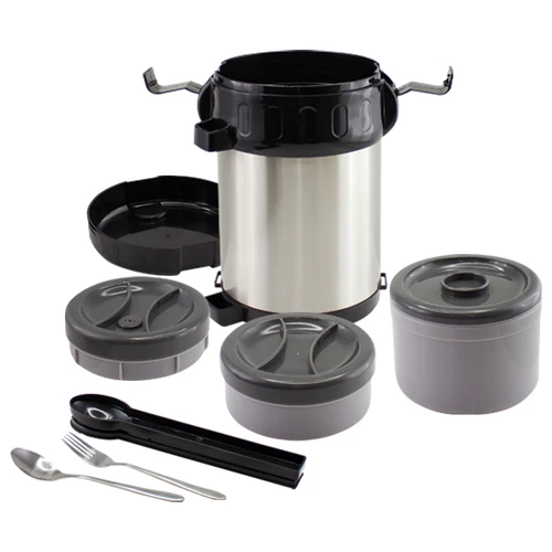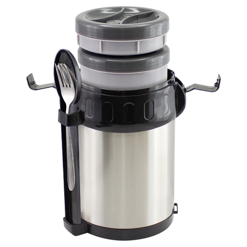 Termo de Acero inoxidable de 2 litros, con 3 compartimentos plásticos interiores independientes. Ideal para mantener alimentos tibios por más tiempo, para el almuerzo o la colación escolar. Incluye juego de cubiertos metálicos (tenedor y cuchara pequeños) en contenedor plástico negro. Presentación en estuche de cartón blanco.