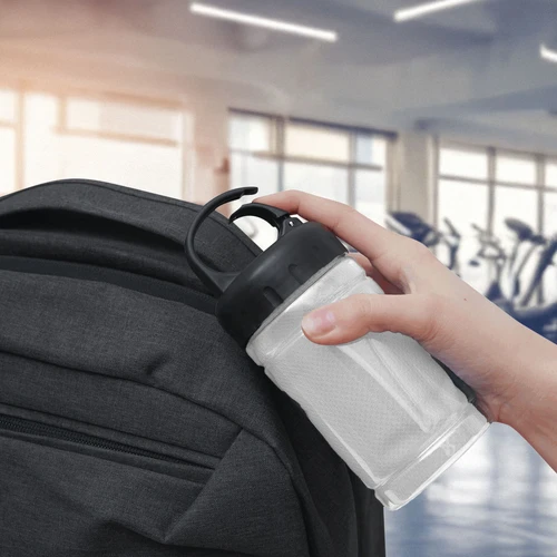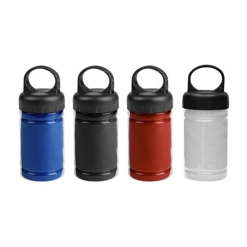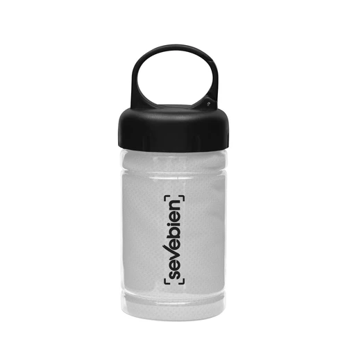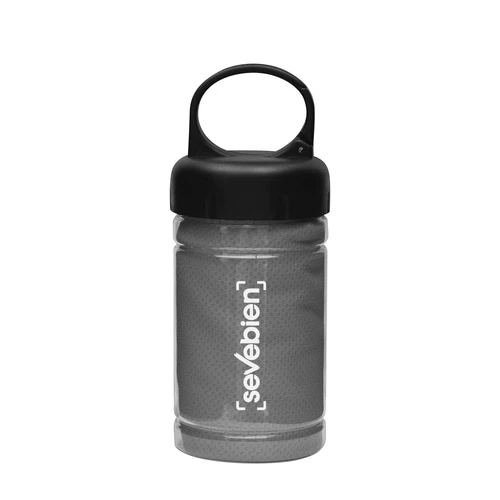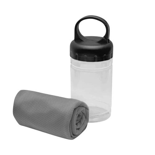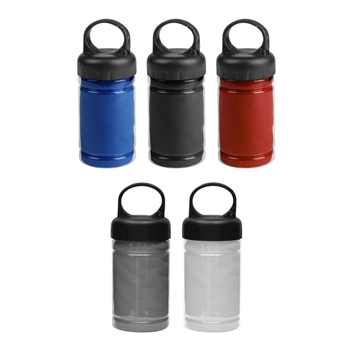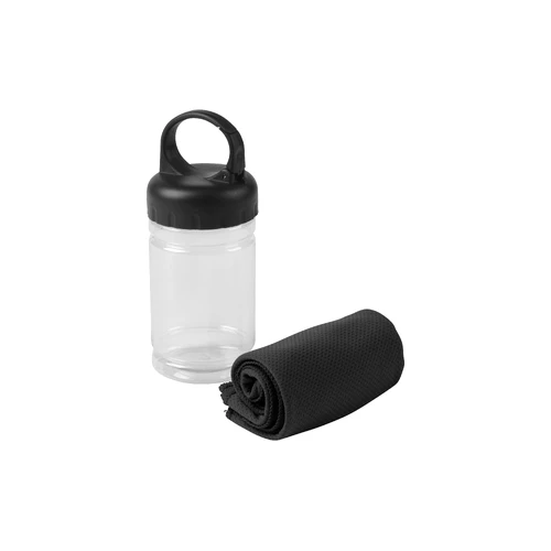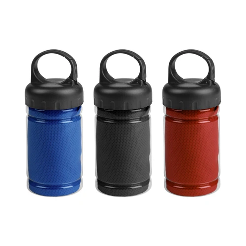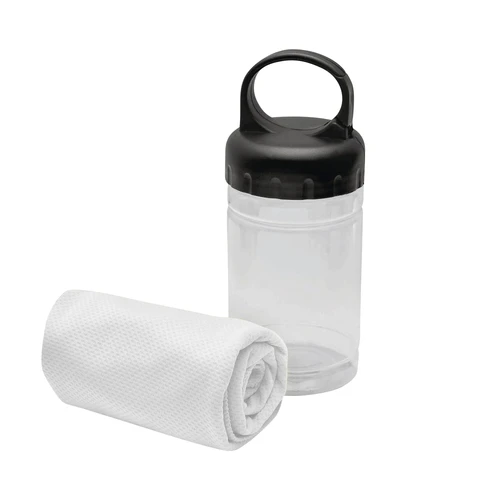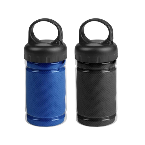 Medidas toalla 79 x 29 cm / Medidas frasco: Ø6,5 x 17 cm. Políester. Toalla de enfriamiento en un estuche de plástico transparente. Para un efecto refrescante humedezca la toalla con agua o agregue agua en el cilindro e incorpore la toalla. Tapa a rosca con mosquetón.