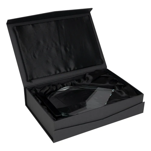 Elegante Trofeo Galvano de Cristal modelo "Tear", con base de cristal negro. Presentación en caja de cartón forrado negro con cierre imantado, interior acolchado de espuma y tela poliéster satinado negro, con troquel.
