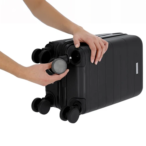 Práctico trolley de 4 ruedas giratorias extraíbles, en rígido ABS. Cierre de cremallera de doble tirador. Interior con compartimentos y diversos. Gracias a su tamaño compacto y a la extracción de las ruedas llevar un trolley como equipaje de manos no será un problema. Incluye bolsa para guardar las ruedas.