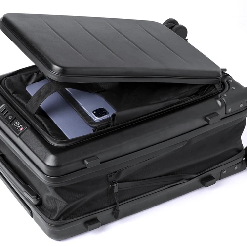 Práctico trolley plegable de 4 ruedas giratorias, en rígido ABS. Con la posibilidad de poder ampliar su capacidad por su parte central extensible, con cierre de cremallera de doble tirador. Equipado con un bolsillo acolchado para portátil de hasta 15 pulgadas y bolsillo para tablet de hasta 10 pulgadas, en la parte frontal. Cierre conforme a los estándares TSA -Administración de la Seguridad en el Transporte-, que permite a las autoridades de aduanas inspeccionar el contenido del equipaje sin tener que forzar o romper el cierre, a traves de una llave especial a disposición de la autoridad.