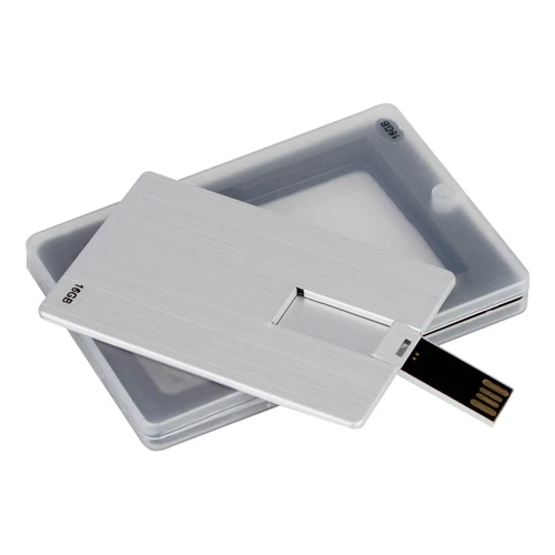 USB 2.0 Pendrive memoria de 16GB, forma y tamaño Tarjeta de Crédito 100% plateado, con USB twist-system. Presentación en elegante estuche de plástico translúcido con cierre imantado, dentro de cuna de esponja EVA negra.