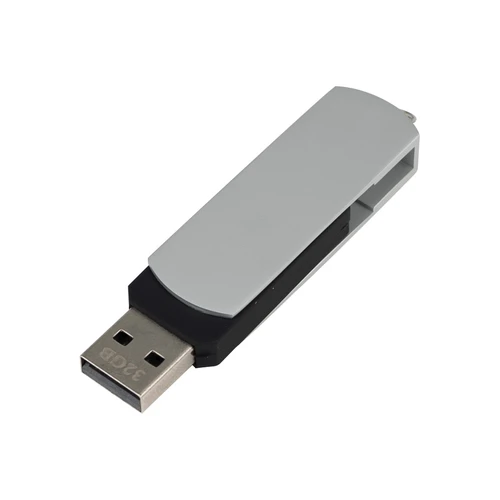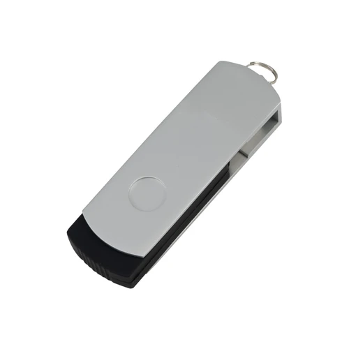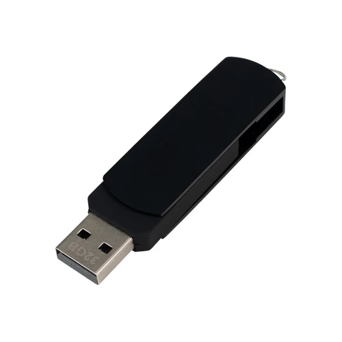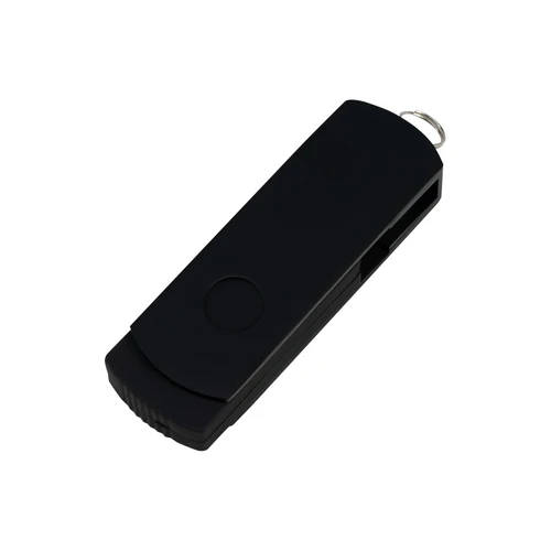 USB Pendrive 2.0 con 32GB de memoria, con cuerpo de silicona negra y carcasa metálica de giro de color, removible. Presentación en estuche de PVC translúcido.