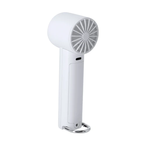 Ventilador portátil en ABS con acabado mate. Cuenta con botón de encendido/apagado y mosquetón de aluminio con función de soporte en el extremo inferior, ideal para un transporte cómodo. Dispone de 3 modos de velocidad. Potencia: 2–6 W. Batería recargable Li‑Ion 14500 de 1200 mAh y 3.7 V. Entrada USB‑C 5 V DC 1 A. Incluye cable USB‑A a USB‑C.